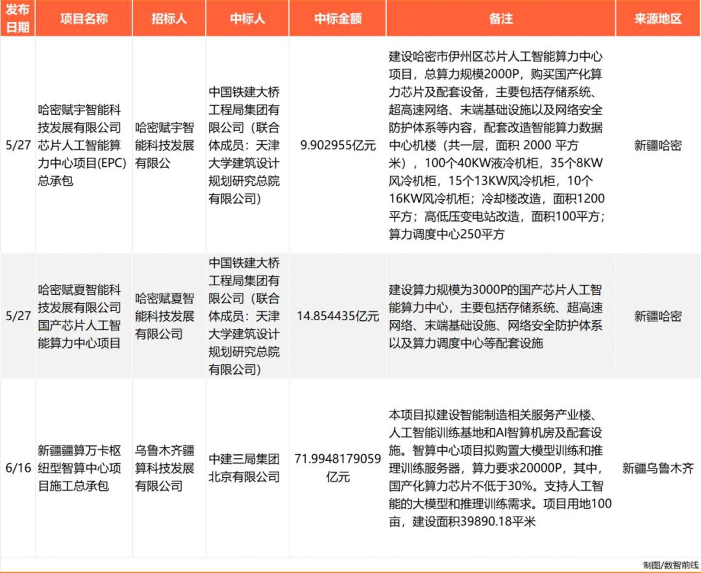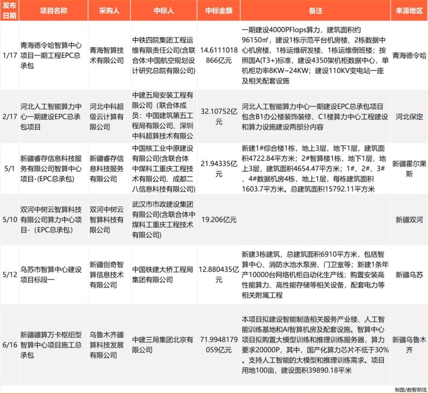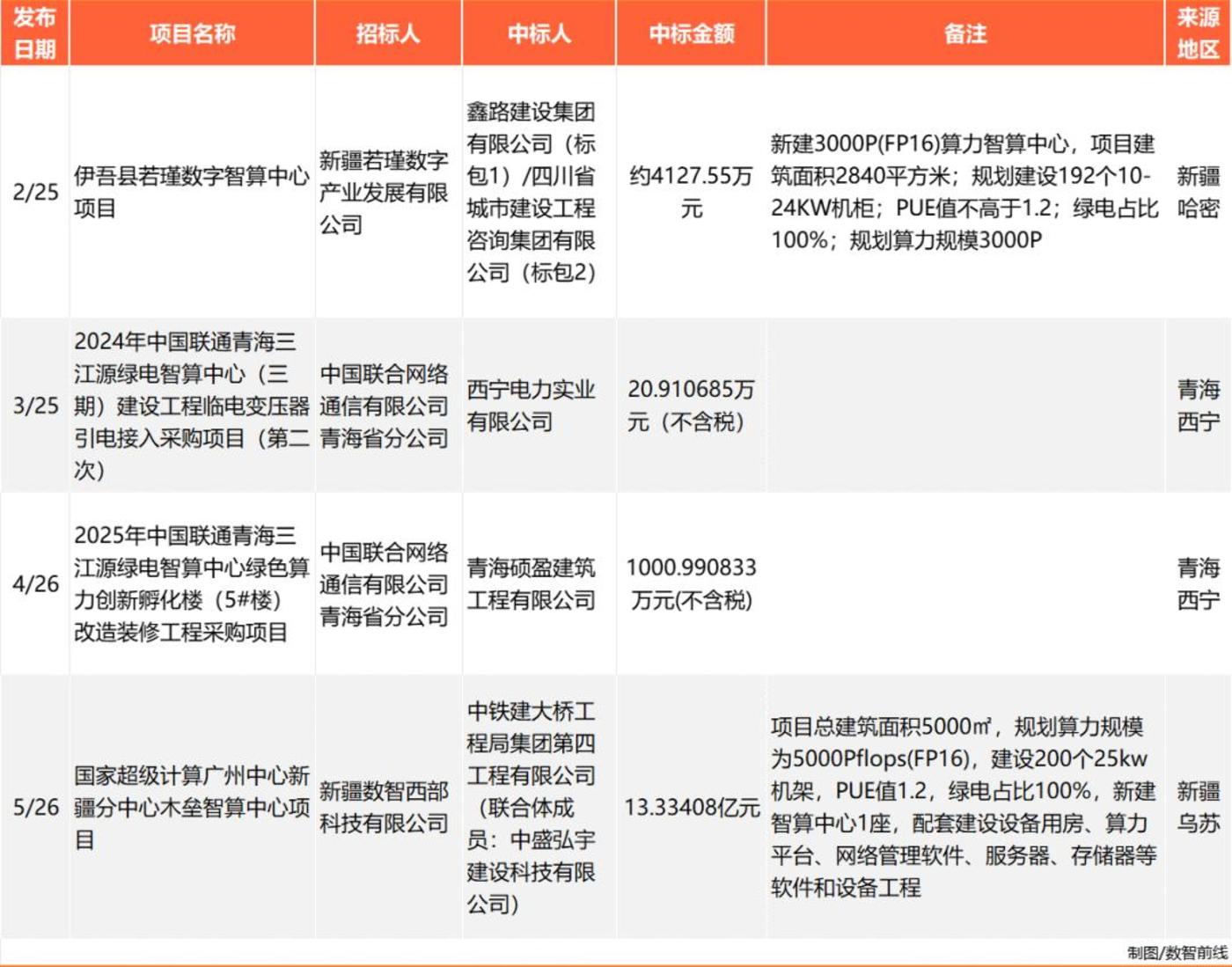大量新规划并开始招标的智算中心,则主要聚集在“东数西算”8大算力枢纽节点,以及新疆、青海等电力供给和气候条件具有显著优势的地区,也是今年上半年,超40个亿元大单中,最主要的项目来源区域。