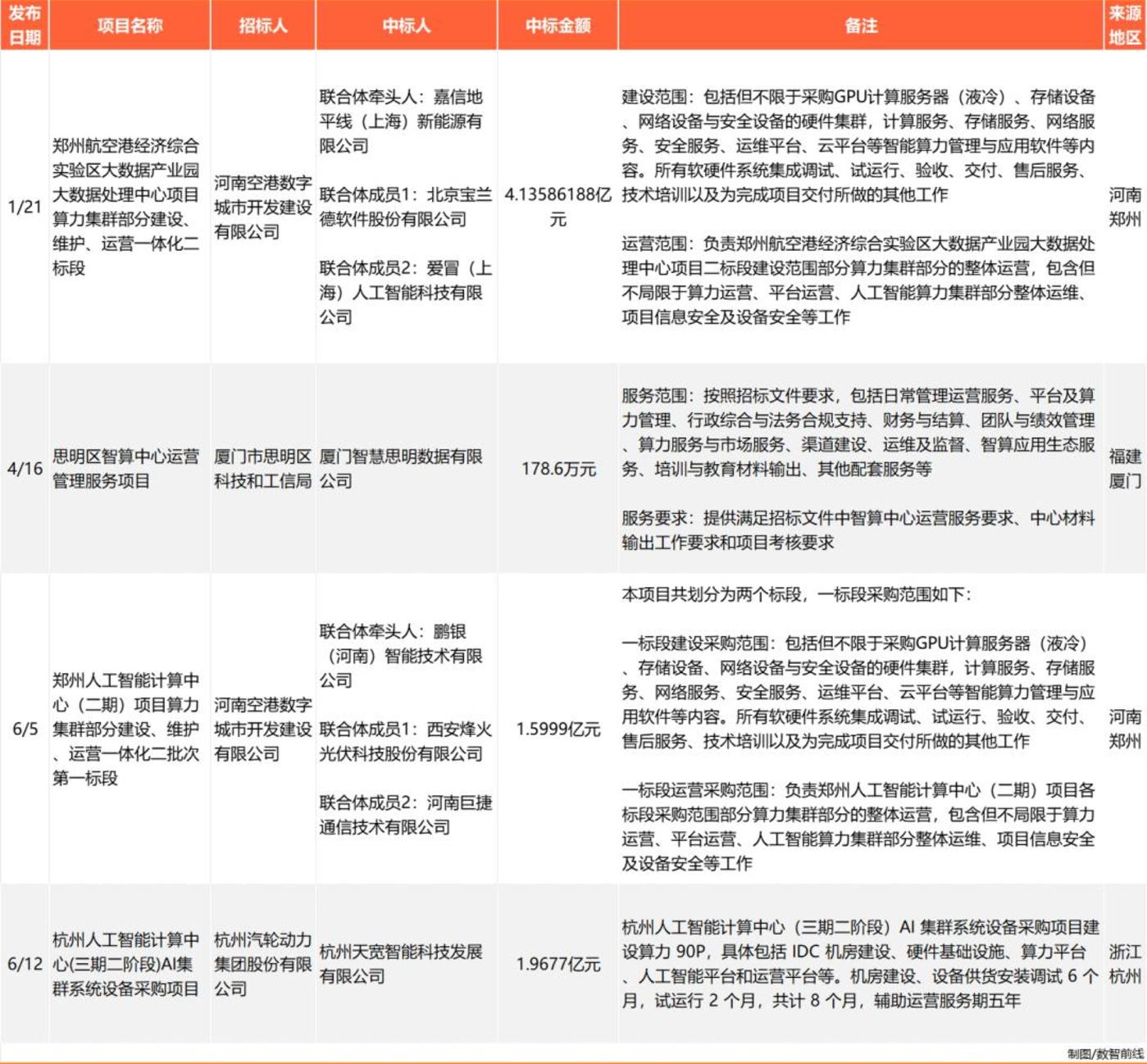 河南次之,至少贡献了5个亿元大单,且这些项目均来自于郑州。郑州也是一个智算建设大城,人工智能产业已成为郑州市重点打造的产业链之一。2024年郑州市政府工作报告,曾明确提出,聚焦打造“算力之城”,加快推进郑州人工智能计算中心等项目建设。