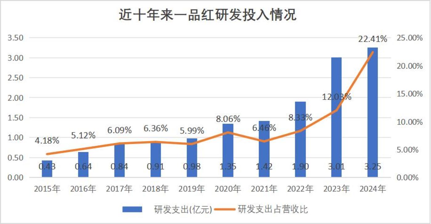 回看一品红发展轨迹,投资者会发现一个令人玩味的现象:在2021年之前,这家药企的创新转型脚步一直不紧不慢。直至2021年8月,一品红与Arthrosi公司成立合资公司,才正式让一品红加注研发投入。至2024年,公司研发投入突然暴增至3.25亿元,占营业收入比重达到了22.41%。