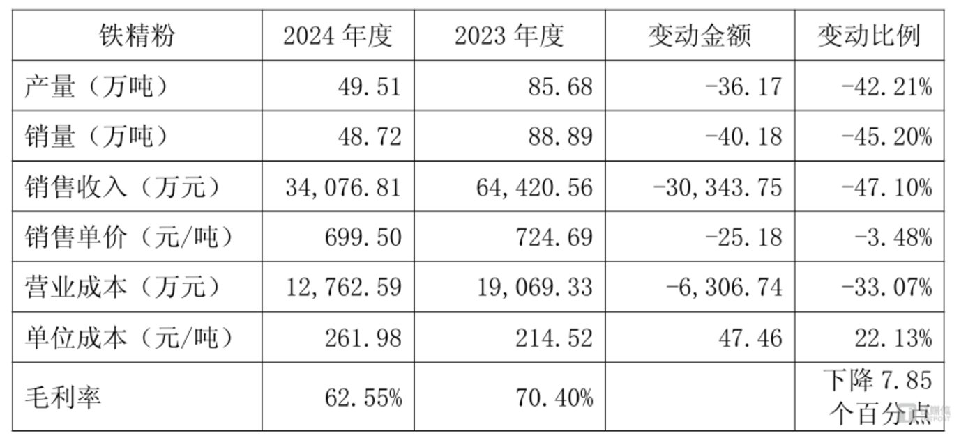 为了进一步扩产,公司对大顶铁矿露天开采项目进行安全设施设计重大变更。但由于扩帮工程受制于审批、天气、环保等因素严重滞后,原矿供应不足。加之2024年广东超长雨季及尾矿库停产42天,产量雪崩。