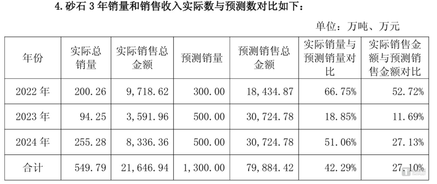 事实上,明珠矿业的砂石业务与预测的数据悬殊。2022-2024年,砂石实际销量仅完成预测的42.29%(缺口750万吨),平均售价39.37元/吨,较预测的61.45元暴跌22.08元。价格暴跌的原因,公司将其归结于房地产与基建需求断崖式下滑。