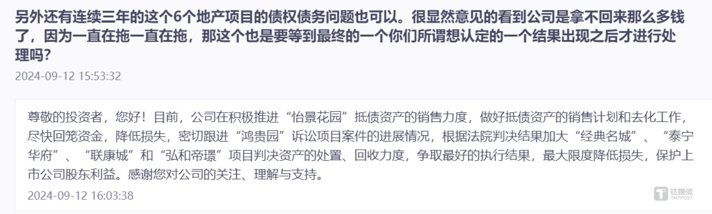 在互动平台上,时有投资者追问前述六个项目回笼资金进展。尽管公司表示,正采取多种方式降低损失,但其对广东明珠的影响,仍漫长且潮湿地影响公司发展。去年公司第四季度营收环比上涨约213%却仍然亏损。核心原因便是,公司计提了六个共同合作投资房地产项目预期信用减值损失和抵债房产-怡景花园资产减值损失。
