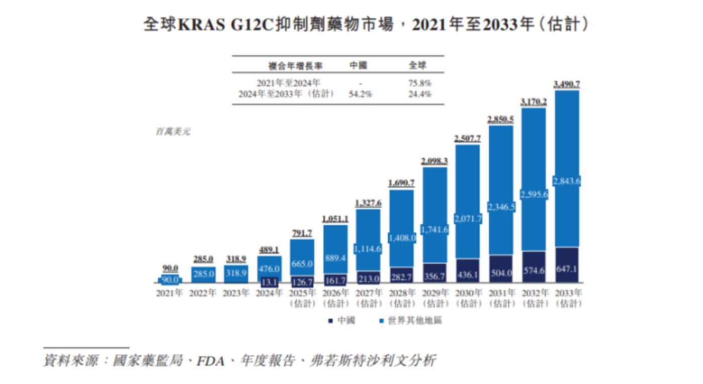 值得一提的是,KRAS G12C突变是NSCLC发病中最为常见的癌基因突变,相关细分赛道增长潜力也正在释放。弗若斯特沙利数据显示,全球KRAS G12C抑制剂药物市场预计将从2024年的4.891亿美元快速增长至2033年的34.907亿美元,复合年增长率为24.4%。