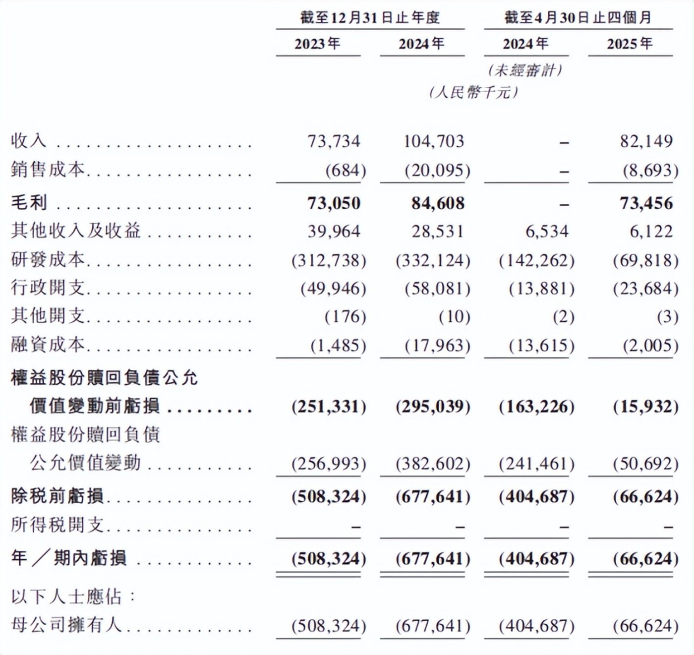 根据招股书,2023年、2024年和2025年前四个月,劲方医药的营业收入分别为0.74亿元、1.05亿元和0.82亿元,净亏损分别为5.08亿元、6.78亿元和0.66亿元,相应的研发开支分别为3.13亿元、3.32亿元和0.698亿元。