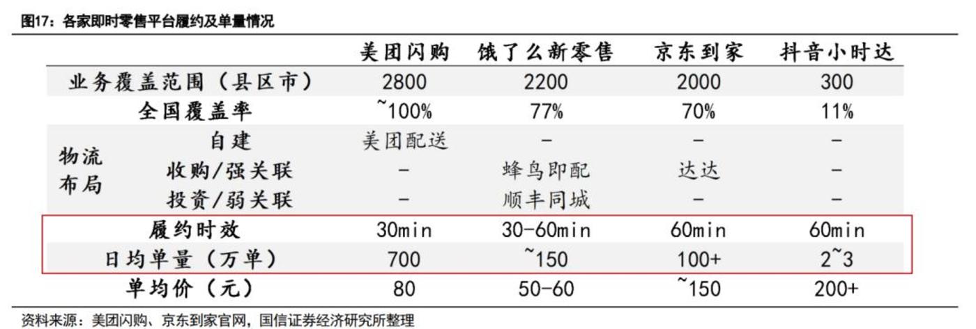 国信证券 2024 年对主流即时零售平台做过调研,履约时效方面,美团闪购在 30 分钟,饿了么新零售在 30-60 分钟,京东到家和抖音小时达都在 60 分钟。