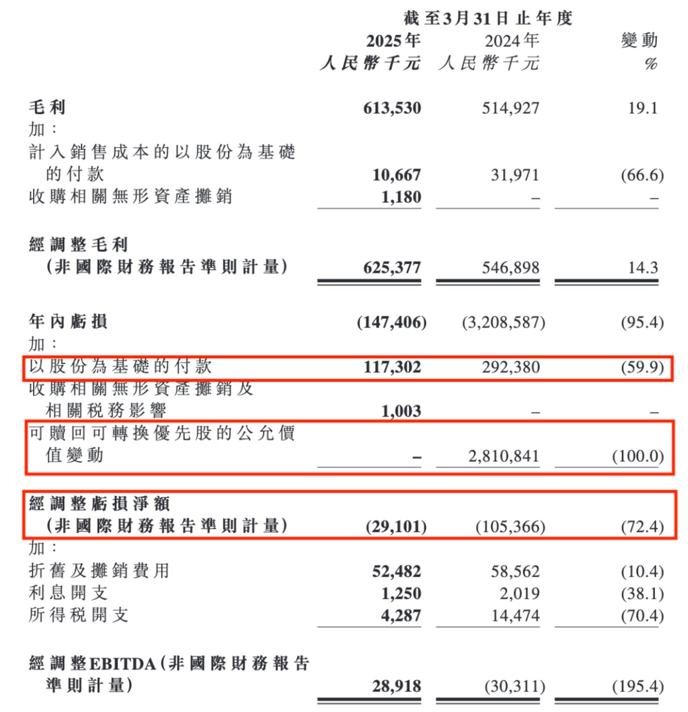 同时,年内亏损从32亿元收窄至1.47亿元,降幅达到95%,经调整净亏损亦从1.05亿元收窄至2910.1万元,同比缩减约72%;公司整体毛利率从2024财年的60.2%增至2025财年的64.9%。