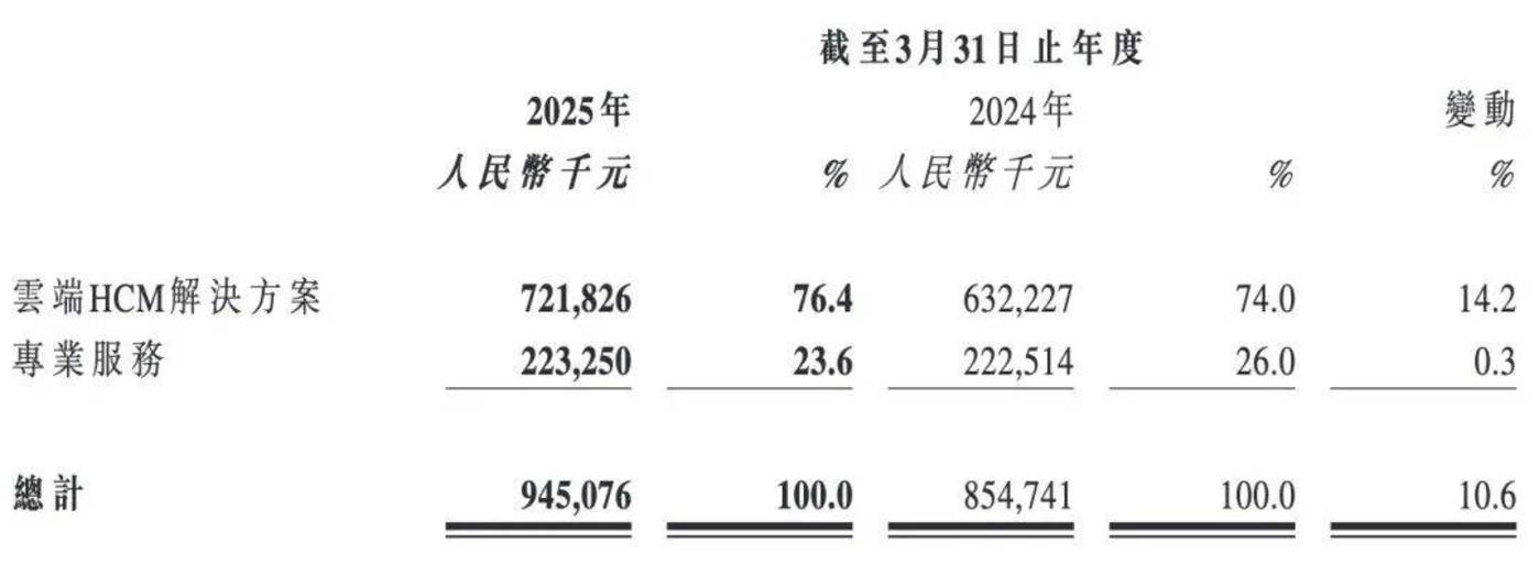 北森控股的专业服务营收从2024财年的2.225亿元微增0.3%至2025财年的2.233亿元。