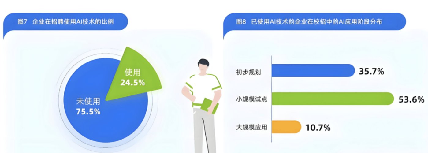 以招聘行业为例,据北森人才管理研究院发布的《2025企业校园招聘AI应用实用指南》显示,国内企业在招聘时使用AI技术的比例仅为24.5%,并且在已使用AI技术的企业中,大规模应用的比例仅为10.7%,超过一半的企业仅是小规模试点阶段。