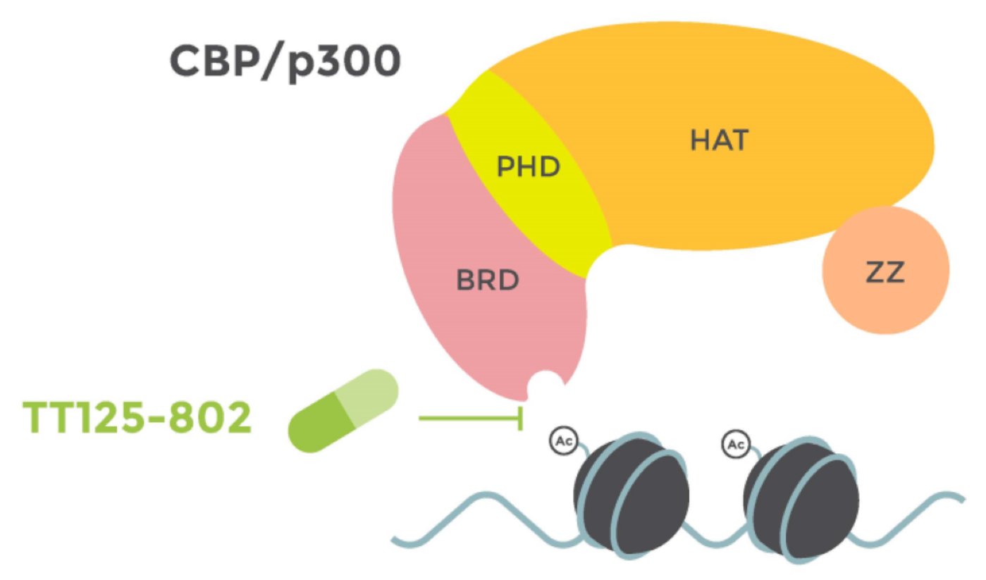 Tolremo已经研究证明,TT125-802可作为单一疗法或与实体瘤和血液系统恶性肿瘤的靶向药物联合使用。TT125-802 与KRAS、EGFR和AR抑制剂等靶向疗法联合使用,可在非小细胞肺癌、结直肠癌和前列腺癌的临床前模型中提供更为深入、持久的疗效。2023年11月,Tolremo宣布完成首次人体临床试验,完成首例患者给药;2025年6月,Tolremo宣布TT125-802是首个在实体瘤中表现出显著临床活性的CBP/p300抑制剂,能够对KRAS-G12C和EGFR突变型非小细胞肺癌实现快速、深度及持久的药效反应,并展现出同类最佳的安全性,且未出现血小板减少症。