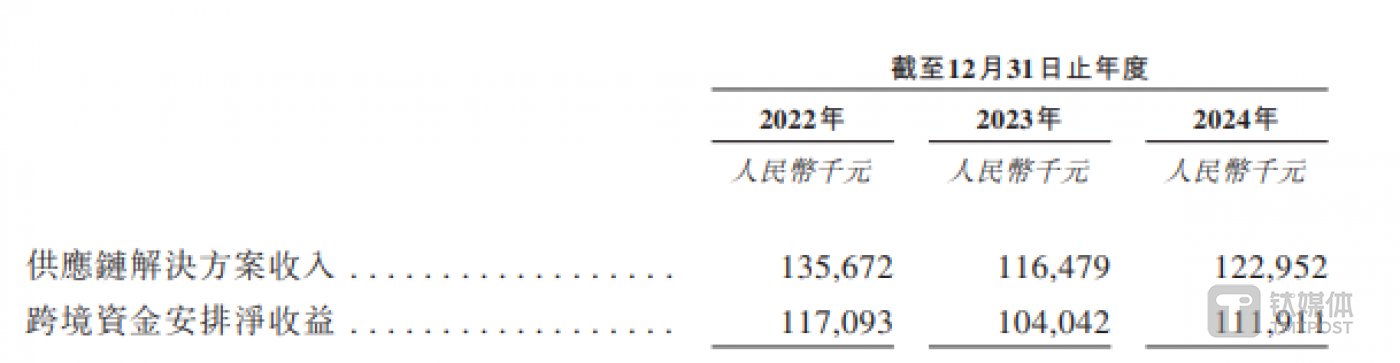 可见,供应链解决方案、跨境资金安排净收益在公司营收体系中呈现并驾齐驱的格局,共同构成了企业经营的关键支撑。