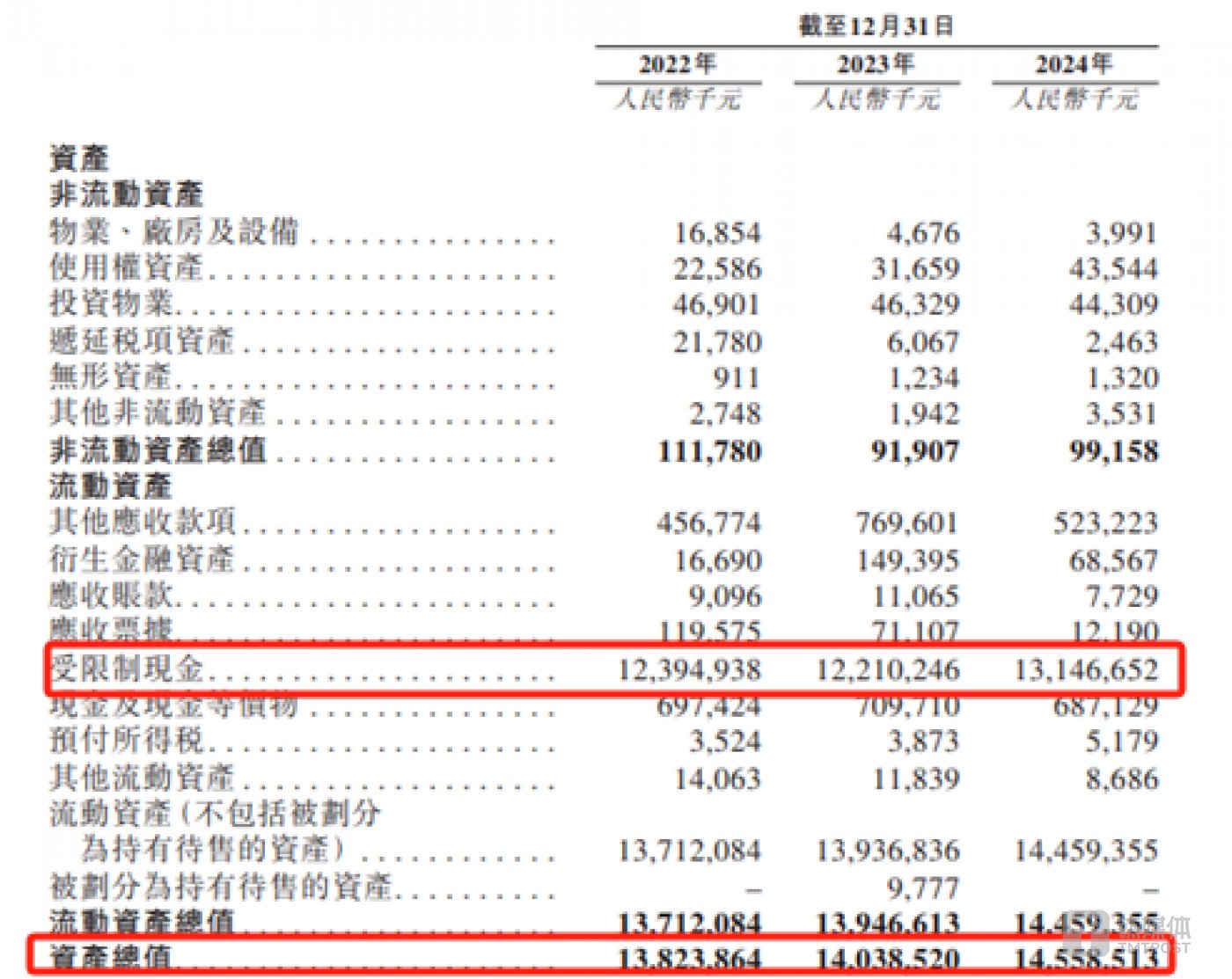从资产方面来看,截至2022年末、2023年末、2024年末,华富洋的资产总额分别为138.24亿元、140.39亿元、145.59亿元,其中受限制现金分别为123.95亿元、122.1亿元、131.47亿元,也就是说,华富洋每年有近9成的资产为受限制现金。