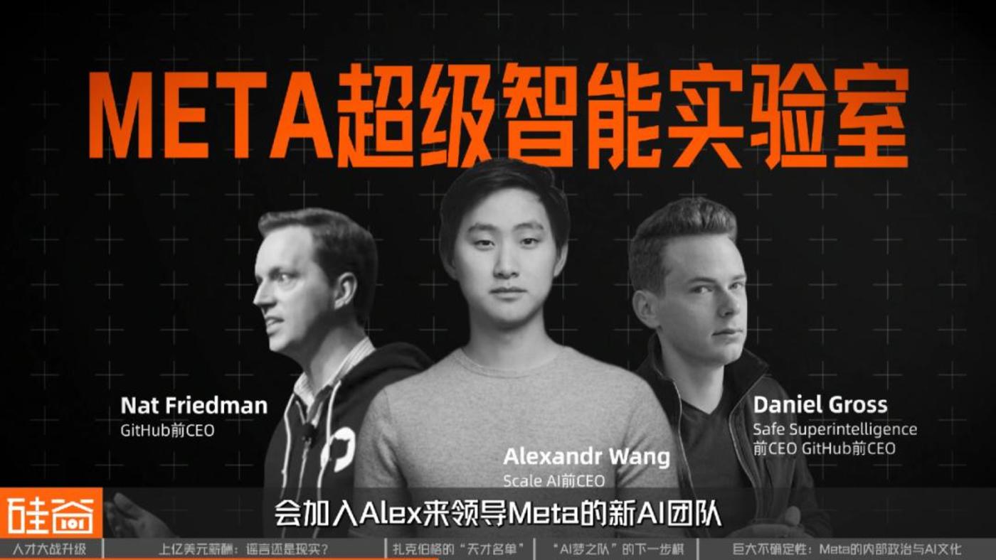 除了上周101 weekly节目所提到的,Meta斥资143亿美元收购Scale AI 49%的股份,核心目的之一是把创始人兼CEO Alex Wang挖过来,领导Meta的新超级智能实验室(MSL)。同时,Meta还让另外两位关键人物——GitHub前CEO Nat Friedman和Safe Superintelligence前CEO Daniel Gross——加入Alex,共同领导新AI团队。