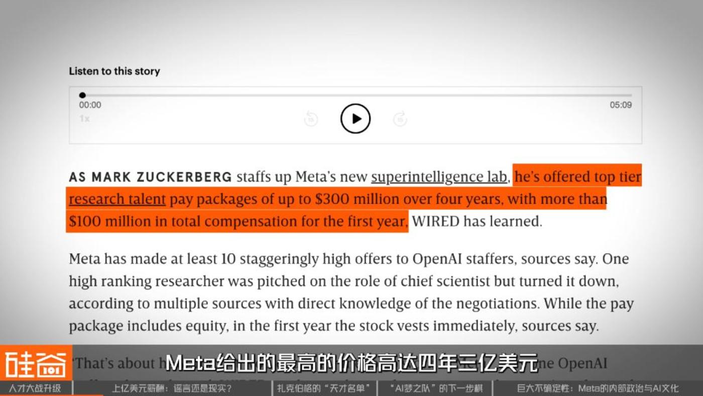 而《连线》杂志报道,Meta给出的最高价高达四年三亿美元,其中第一年总薪酬超过一亿美元。也有其他媒体报道,1亿美元是signing bonus(一次性的签约奖金)。