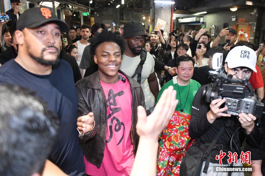 4月7日,美国网红“甲亢哥”来到湖南长沙开启直播,感受长沙的烟火气和夜生活。图为“甲亢哥”与粉丝互动。 中新社记者 杨华峰 摄