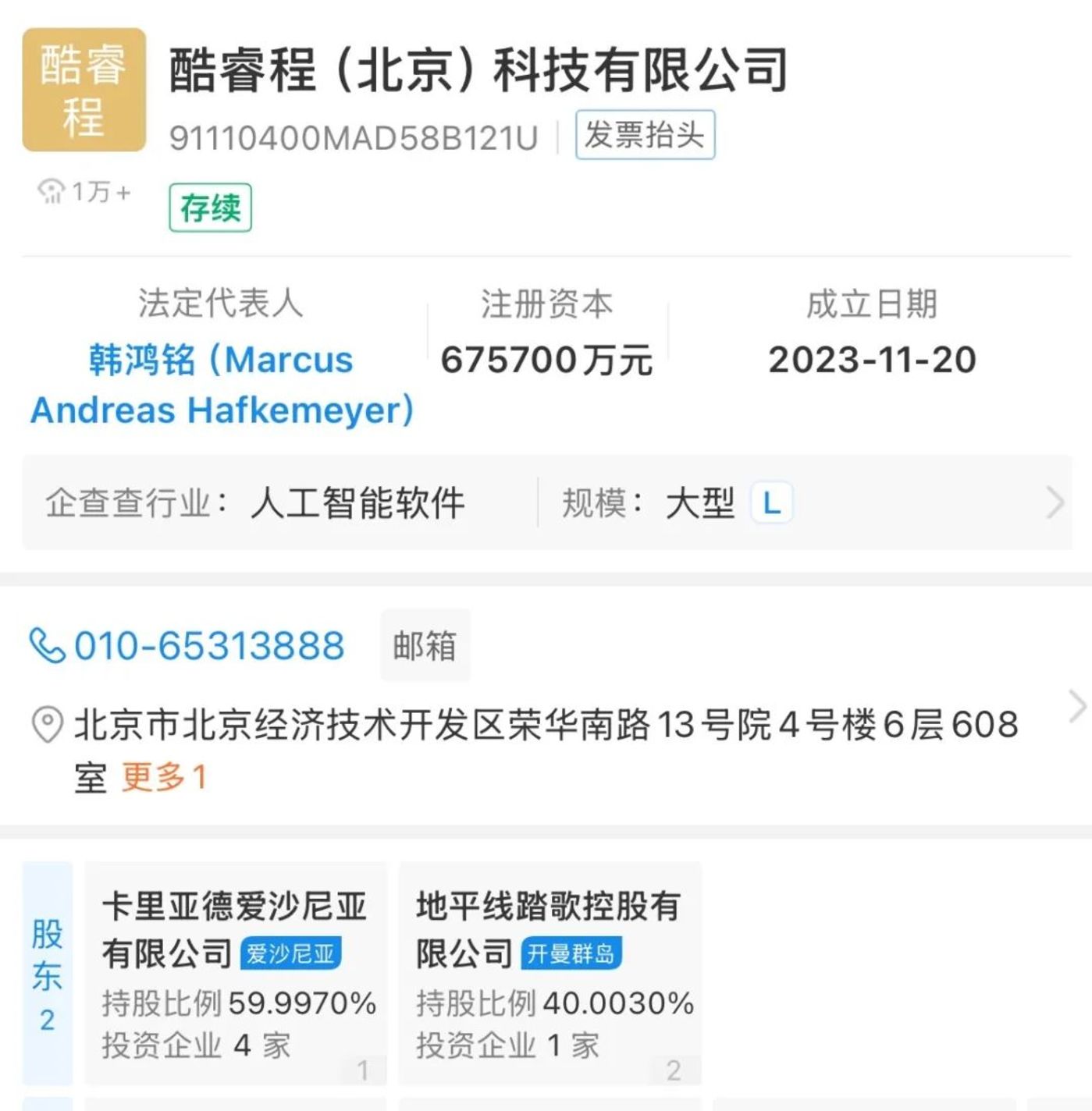 大众汽车与地平线成立的合资公司,图源企查查