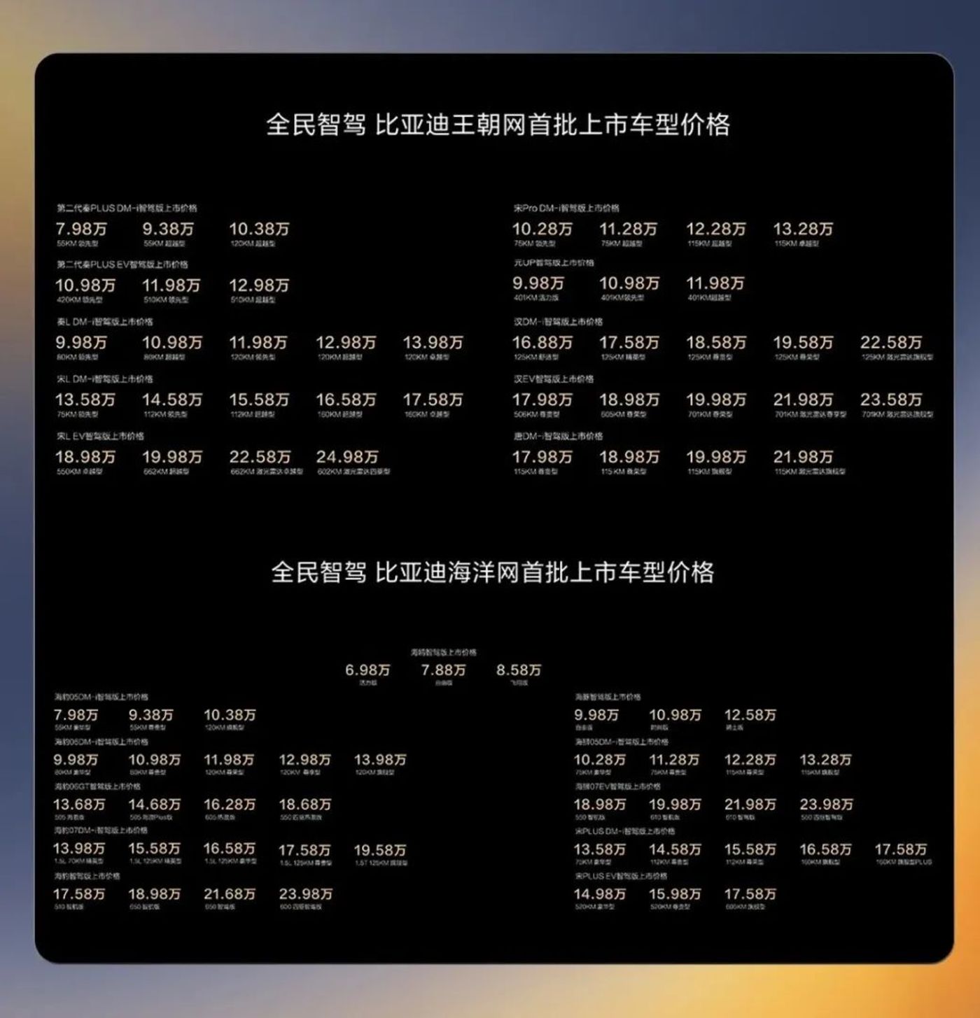 “王朝“与“海洋“两大系列智驾升级价格图,图源比亚迪官方微信公众号