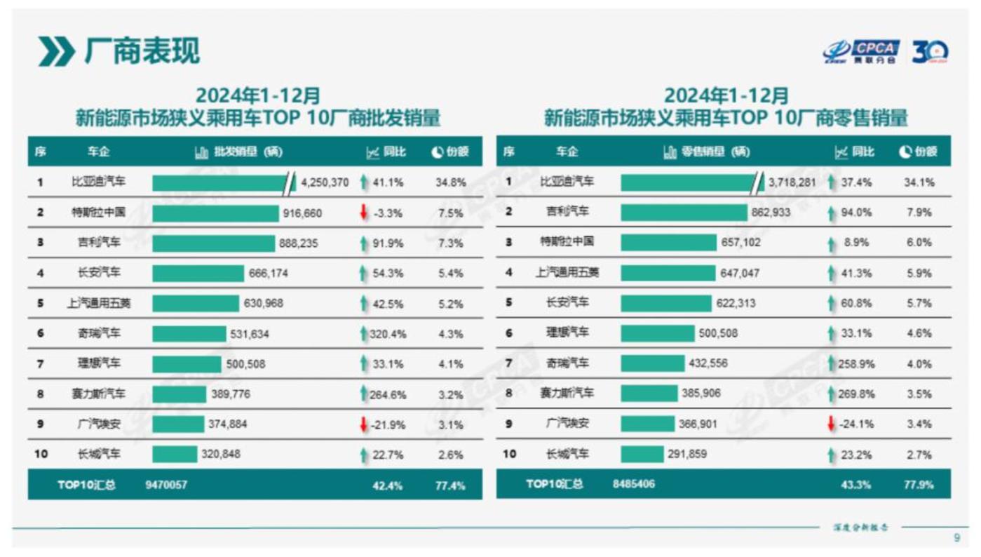 2024年新能源乘用车批发及零售销量排名,图源中国汽车流通协会微信公众号