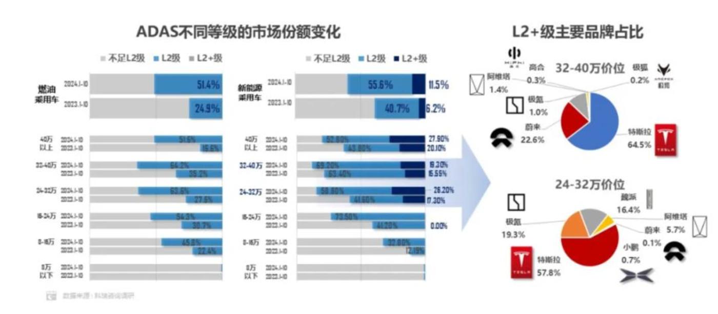 据《2024麦肯锡中国汽车消费者洞察报告》,愿意对智能驾驶支付的消费者占比从2022年的42%下降到2024年的28%。而乘联会数据显示,2024年1-10月,我国乘用车L2级及以上的辅助驾驶功能,32-40万元车型是L2+辅助驾驶落地最广的车型上。