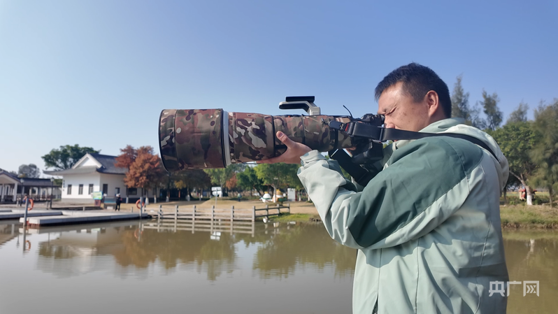 一看到水鸟的精彩瞬间,陈严雪立马端起相机抓拍(央广网见习记者 于东冉 摄)