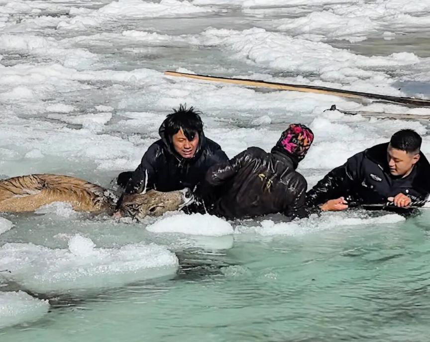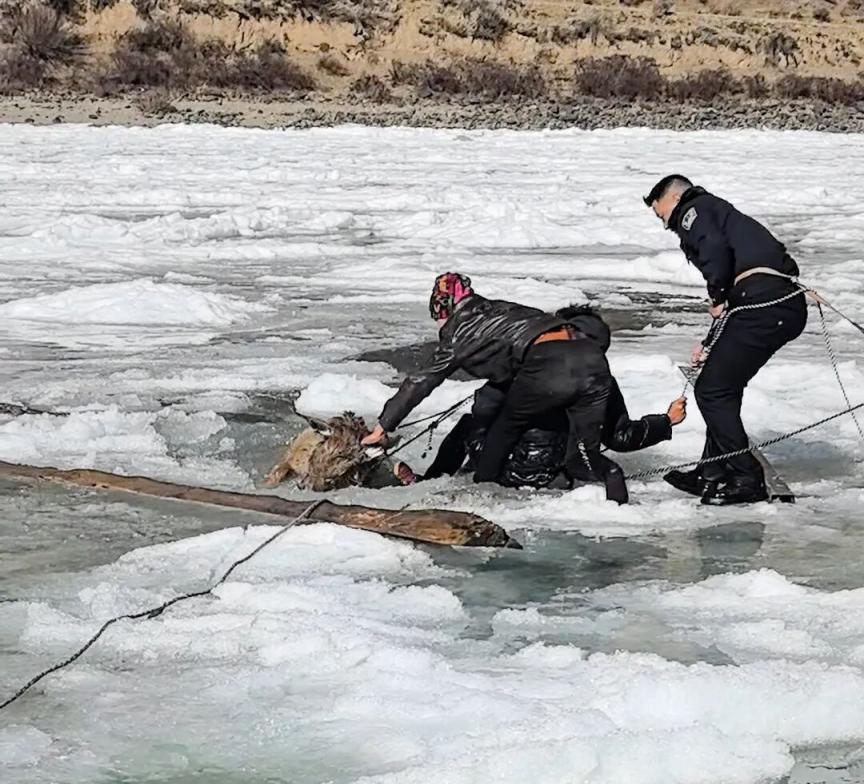零下10摄氏度,时间就是生命。辅警降拥扎西带头踏入冰冷刺骨的河水中,靠近白唇鹿所在位置后,利用救援绳索将被困白唇鹿精准套牢,岸边的警民齐心牵引。历经一小时的救助,3只被困白唇鹿逐一被救起。