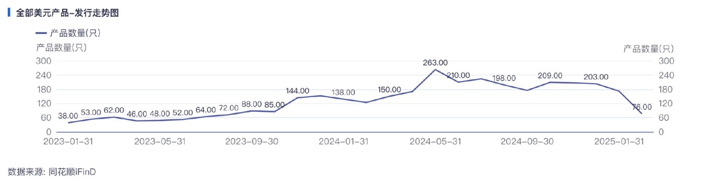 iFinD数据显示,境内美元产品发行数量在2024年5月达到了263只的高点,远超往年的平均水平,2025年开年则出现了大幅走低,从12月的203只回落到了78只。