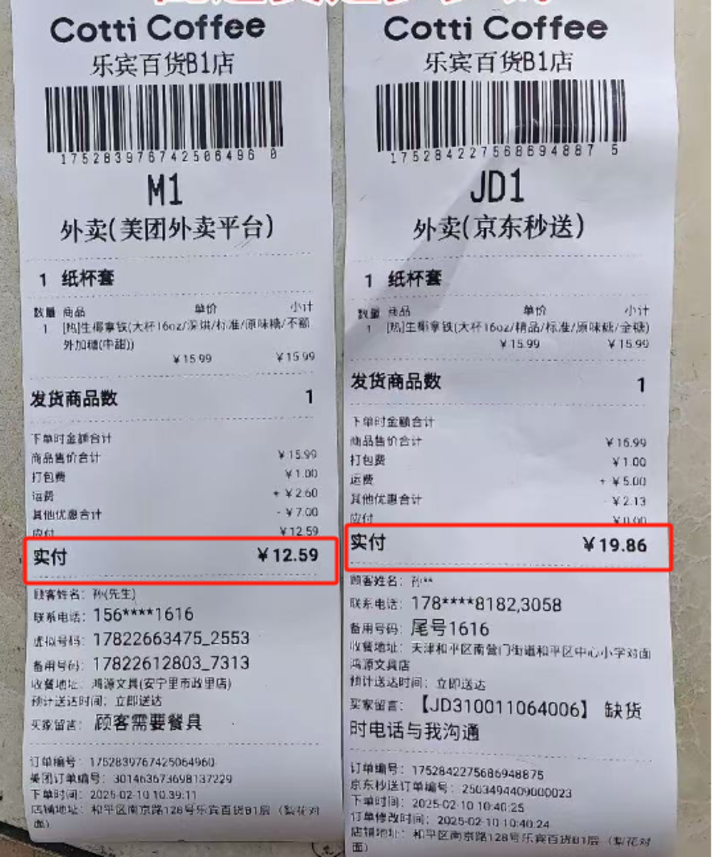 站在用户角度来看,因京东外卖履约成本更高。比如说,消费者在相同商家、相同配送距离、相同SKU外卖数量,使用京东外卖点餐的到手价高出美团到手价近7.3元,这会让不少消费者继续在美团外卖上点餐。