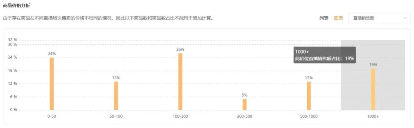 以上文中提到的达人主播@蕙质兰心为例,据飞瓜快数显示,其在当天的直播中,主打箱包饰品、家装建材、手机数码、厨卫家电类产品,客单价平均达到224元。但从商品价格分布来看,近五成商品的价格处在0-50元和100-300元两个价位中,300元以下商品在总销售额中的占比高达63%,1000元以上的高客单价商品在总销售额中的占比不足20%。