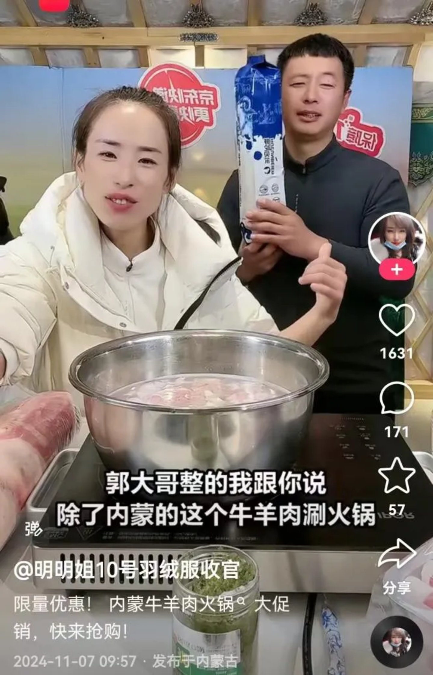 镜头前,主播扎着利落马尾,穿着羽绒服。一边熟练地翻煮锅里的呼伦贝尔羊肉,一边热情地与直播间的观众们聊家常互动。这是11月7日,在快手达人“明明姐10号羽绒服收官”直播间中出现的带货场景。