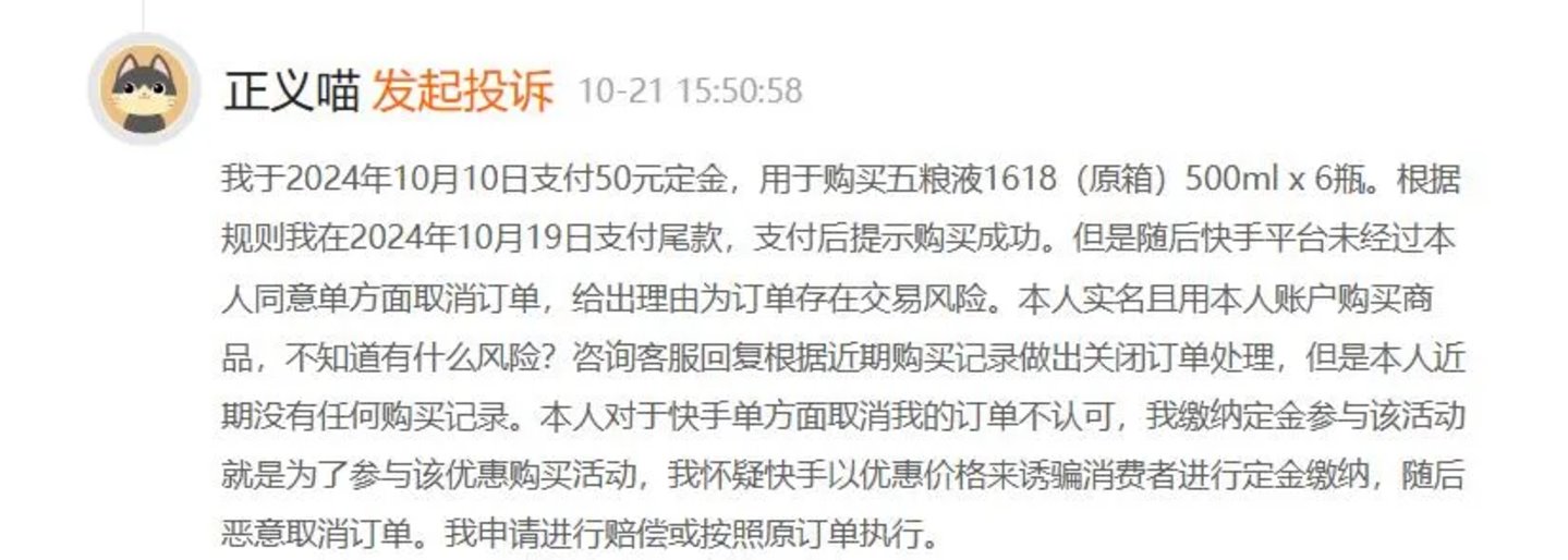消费者表示,在10月10日也就是快手双11大促首日,其向平台支付了50元定金用于购买五粮液1618(500ml×6瓶),按照活动规则于10月19日支付了尾款,支付后平台提示消费者购买成功。但随即在没有征得消费者同意的情况下,单方面取消了该笔订单。平台给出的取消订单理由为:订单存在交易风险。客服也表示,是根据消费者近期购买记录做出的关闭订单处理。但该消费者近期在快手平台中无任何购买记录。