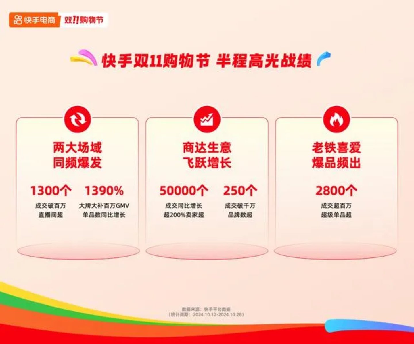 公开信息显示,10月12日至28日“双11”大促期间,快手电商内容场及泛货架场域迎来全域同频爆发,成交破百万直播间数量超1300个,成交同比增长超200%卖家数超5万个。大牌大补百万GMV单品数同比增长1390%,成交破千万品牌数超250个,成交超百万的超级单品数超2800个。其中,10月19日—20日17点,超1.6万位主播单场GMV超过去年双11峰值。