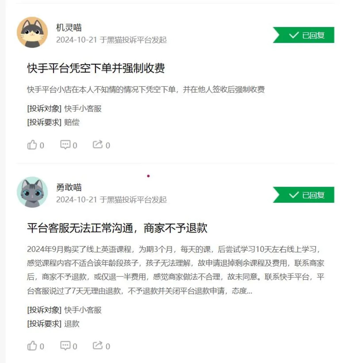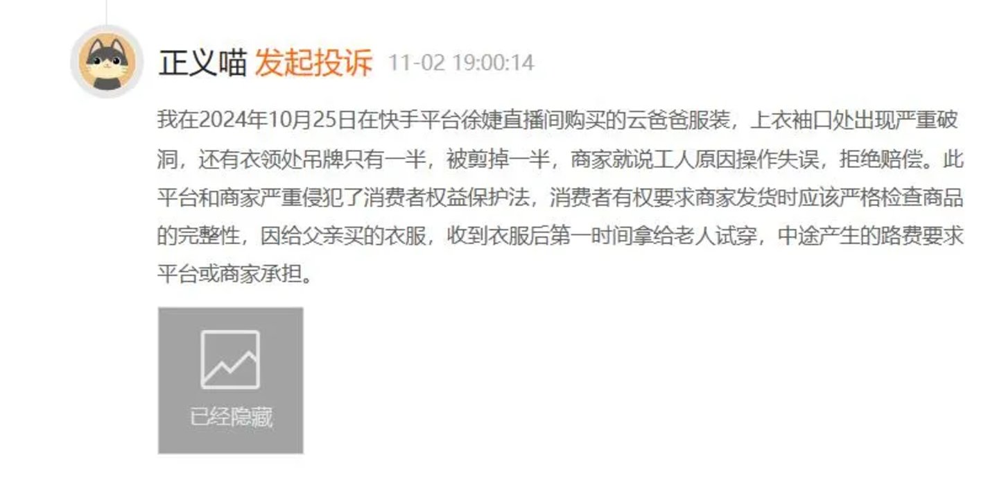 而在10月21日—11月2日期间,多位消费者在黑猫消费者平台发起投诉,称在快手购买的产品货不对板,质感不好,商品被损坏,在申请退货和索赔时遭到商家拒绝,甚至无法联系上平台及商家客服。