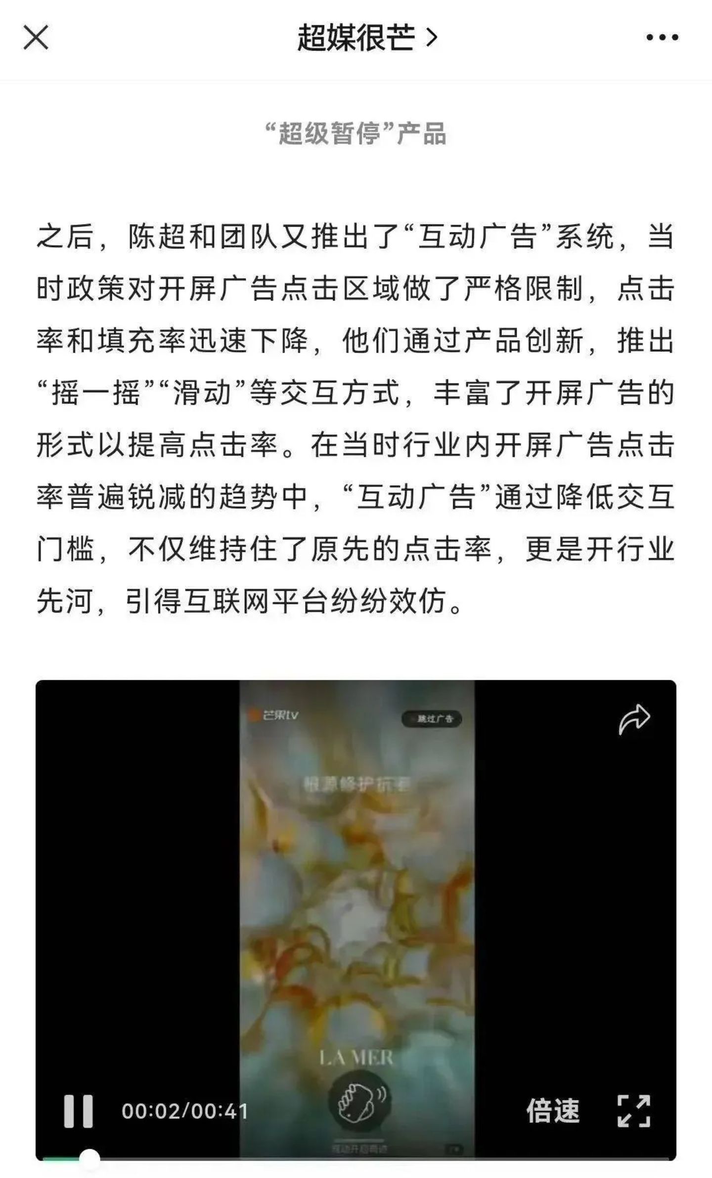 去年3月,名为“超媒很芒”的公众号发布了一篇颁奖文章,其中为一位运营员工颁发“2022年度金芒员工一等奖”,他获奖的理由是带领团队推出了“摇一摇”“滑动”等互动广告。