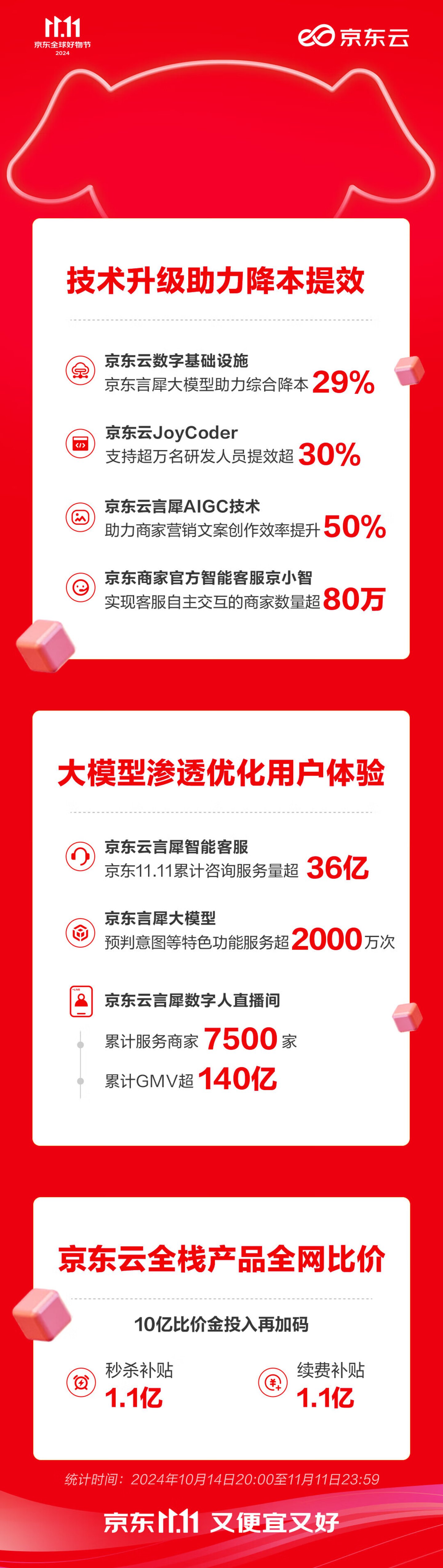 截至11月11日23:59,京东11.11再创新高,购物用户数同比增长超20%,京东采销直播订单量同比增长3.8倍。在这背后,京东云以技术创新持续降低数字基础设施成本,将大模型等智能技术贯穿业务全流程,以真降本助力京东11.11“又便宜又好”。