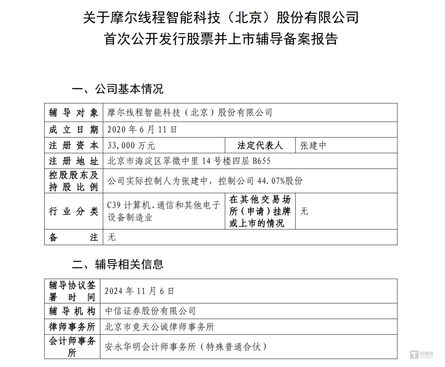 钛媒体App 11月13日消息,中国证监会官网显示,国内全功能GPU独角兽企业摩尔线程智能科技(北京)股份有限公司(简称“摩尔线程”)在北京证监局办理辅导备案登记,正式启动A股上市进程,辅导机构为中信证券股份有限公司。