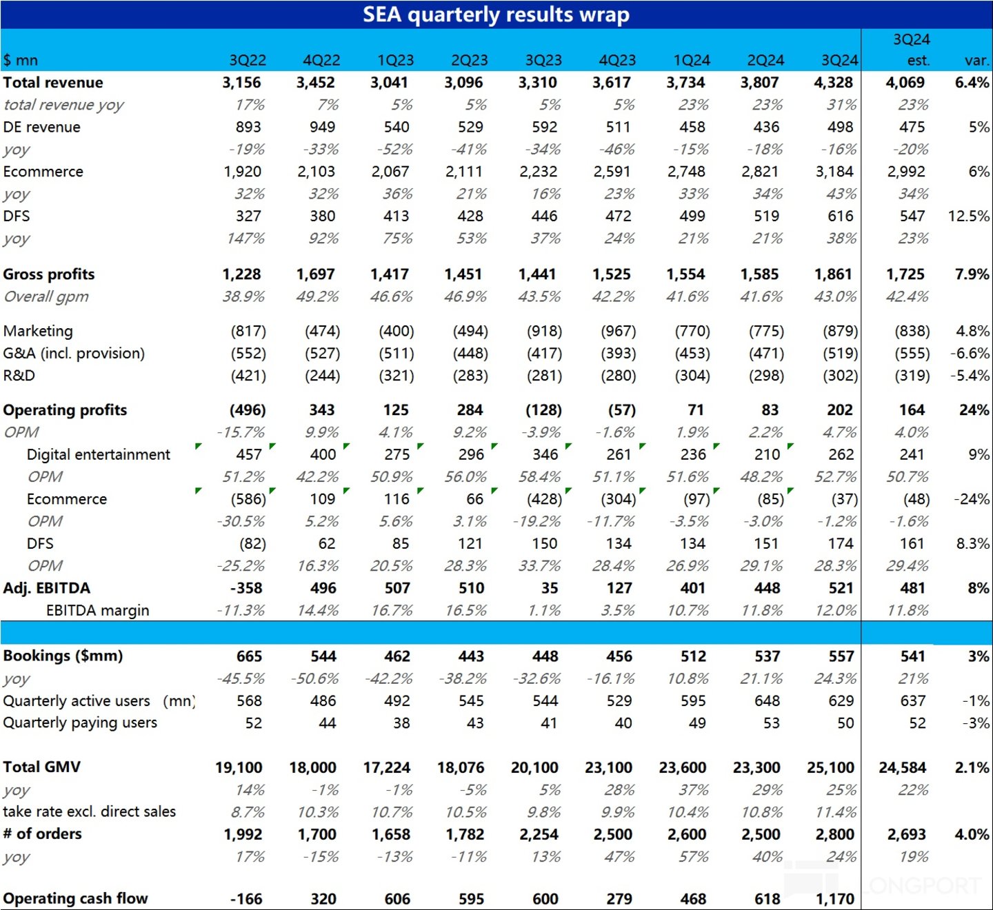 最终 Sea 本季的经营利润达到$2 亿,远超预期的 1.6 亿,经营利润率到达 5%。按公司更关注的 adj.ebitda 指标,本季为 5.2 亿,高出预期约 8%,beat 幅度较毛利再度略有放大。