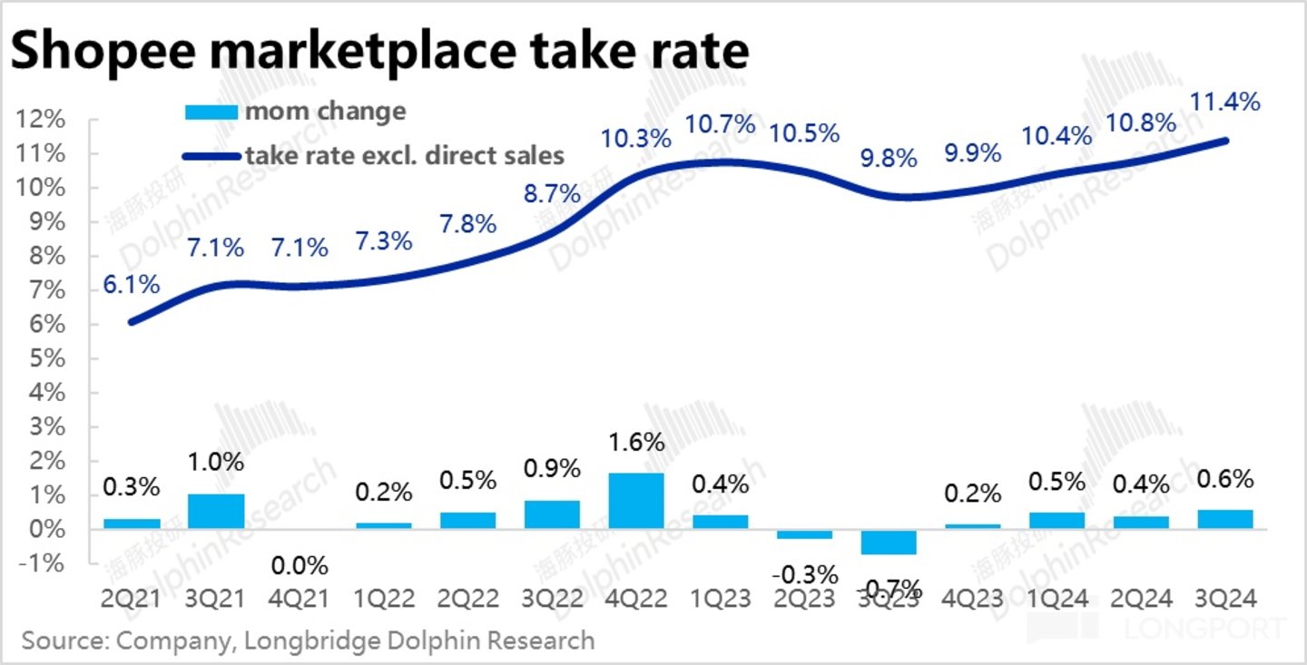 由于上述调整,据测算 Shopee平台业务的变现率本季环比提升了约 0.6pct 到 11.6%,环比提升幅度是 23 年以来的新高。且细分来看变现率的提升几乎完全源自 marketplace 服务(高利润空间),而非 VAS(如配送费)等利润空间较低的收费项。因此变现率的质量也有所改善。