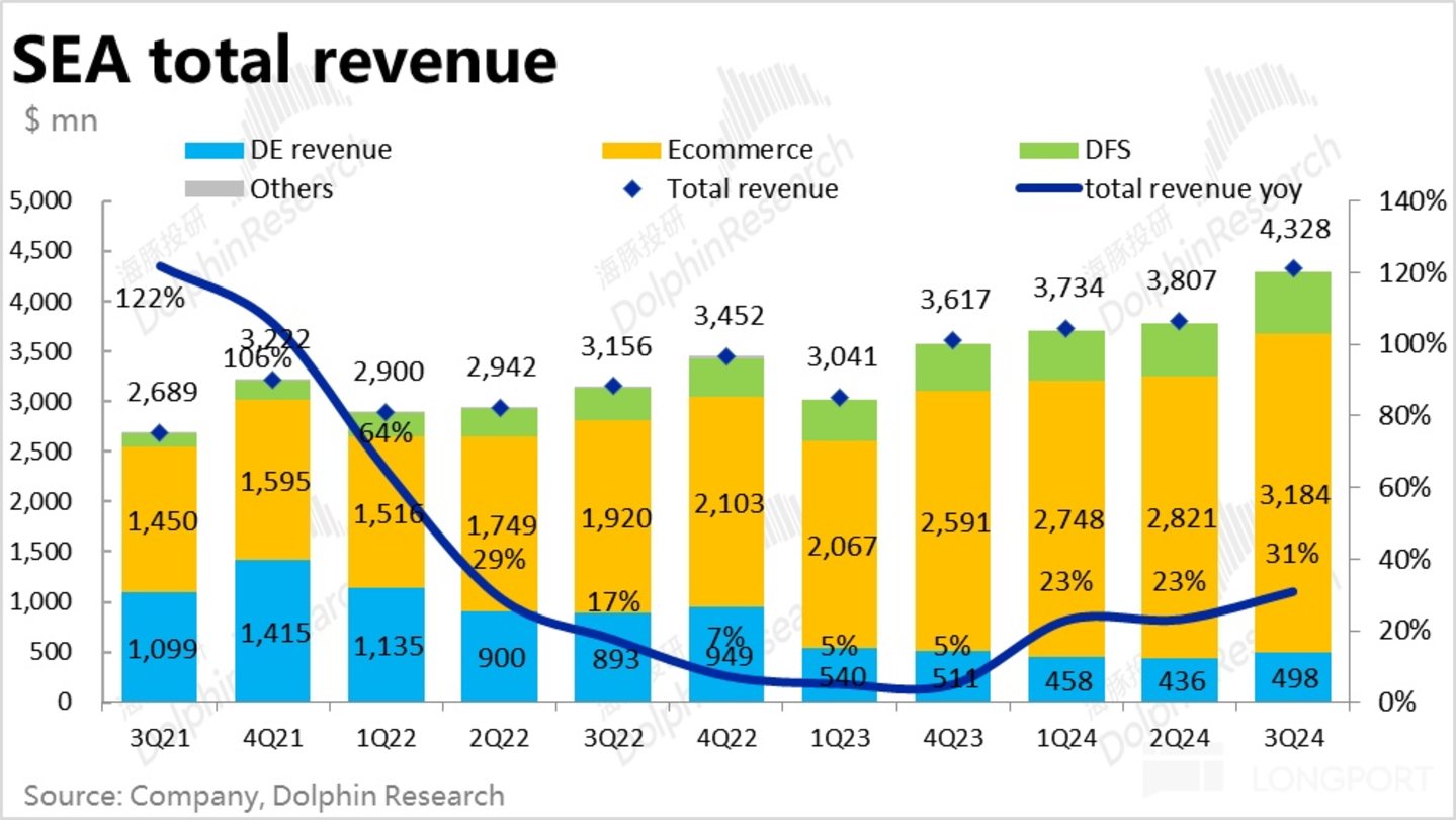 5、整体来看,由于各板块表现都不俗,本季 Sea 整体实现收入 38.1 亿,同比增长 31%,增速环比走高约 8pct,比预期高出约 6.4%。