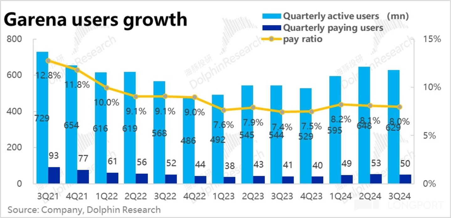 3、相比另两大板块,Garena 游戏业务的表现稍显逊色,主要是本季活跃用户约 6.3 亿人,付费用户数 5000 万人,环比上季度略有走低,且都稍低于市场预期。不过本季的用户数量同比仍是明显增长的,单付费用户贡献流水也同比止跌,因此最关键的游戏流水本季同比增长了 24%,较上季提速 3pct,反而是稍高于市场预期的。