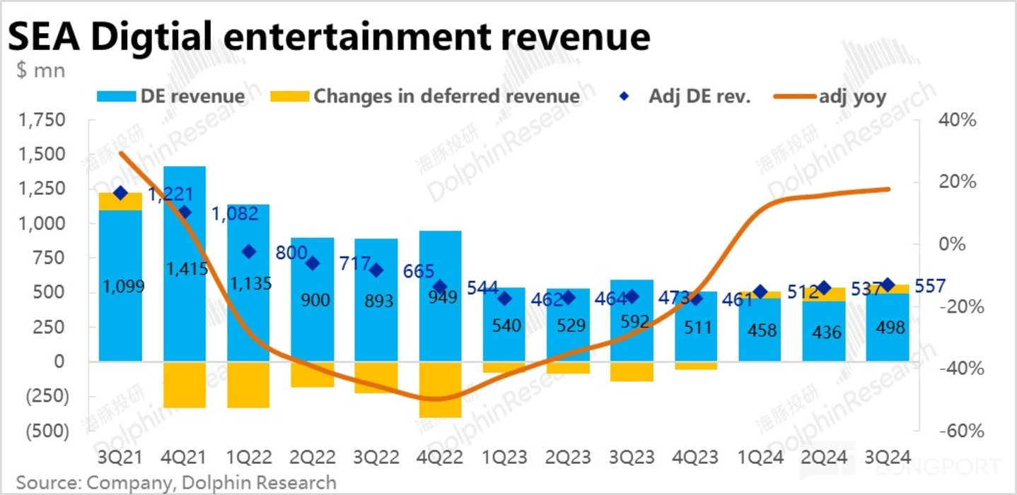 由于游戏流水的加速增长,Garena 的 GAAP 口径下的收入本季同比下滑了 16%,较上季收窄 2pct,实际营收高于预期约 5%。而 GAAP 口径下收入仍同比下滑的主要原因系游戏递延又再度走高。整体上虽然用户数的超预期下滑,是个可能的负面信号,但在本季度内游戏板块的表现仍是在边际改善的。