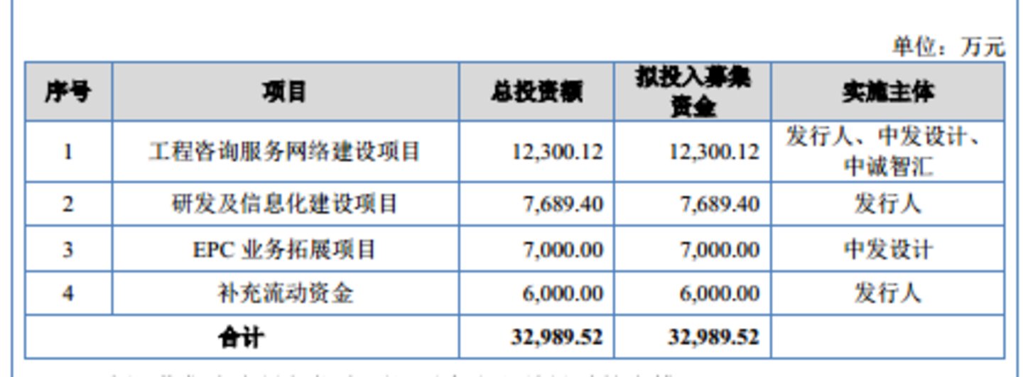 中诚咨询此次IPO欲募集32989.52万元分别用于工程咨询服务网络建设项目、研发及信息化建设项目、EPC业务拓展项目、补充流动资金,具体情况如下: