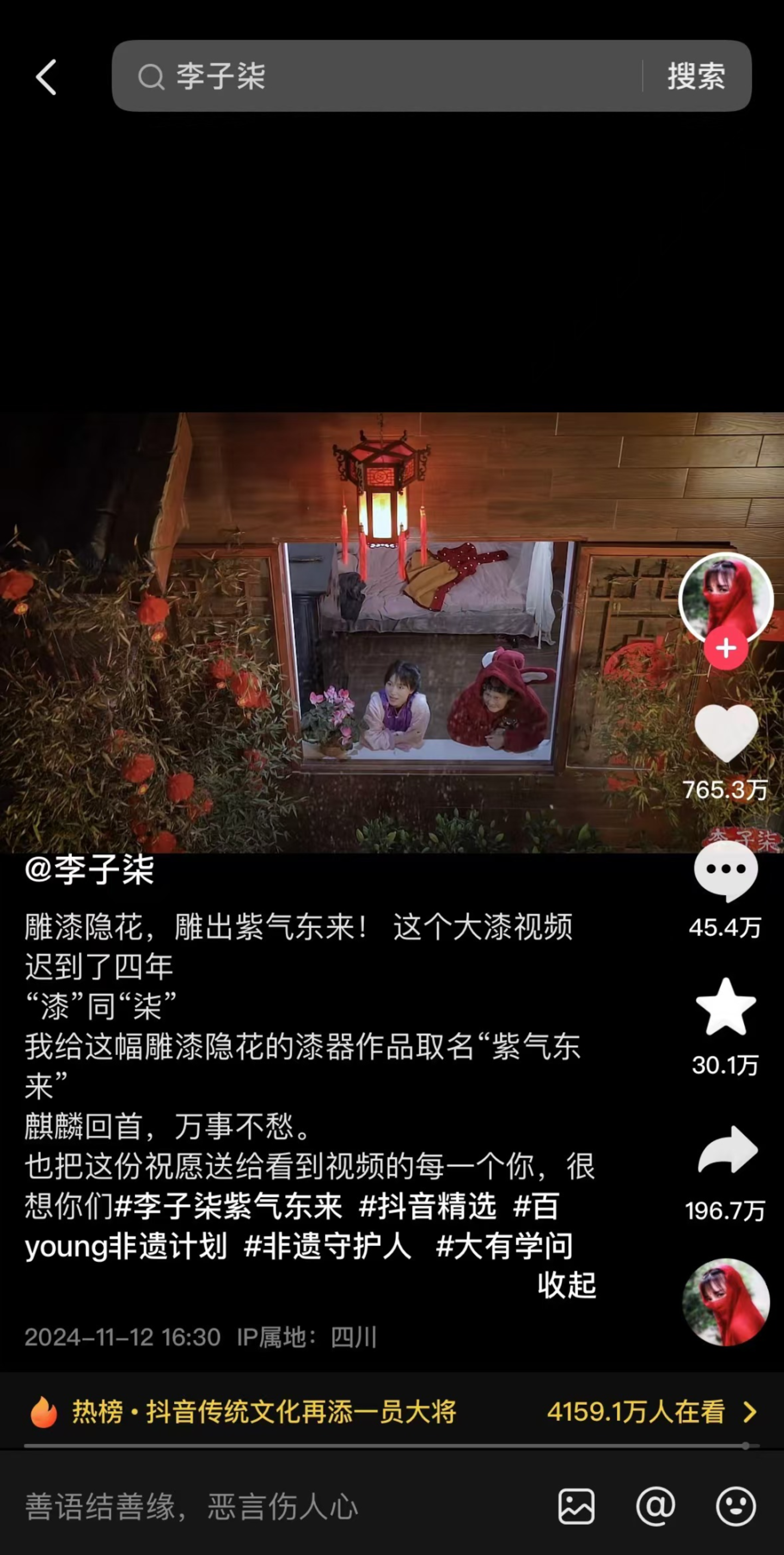 虽然此前传统文化一直都是李子柒的视频内容之一,但新更的视频中,基本上都是关于非遗手艺,例如精心雕刻的柒器、绒花绽放的蜀锦。网友在李子柒的视频中,看到了传统文化的美,也了解到了背后制作过程和承载的匠心。