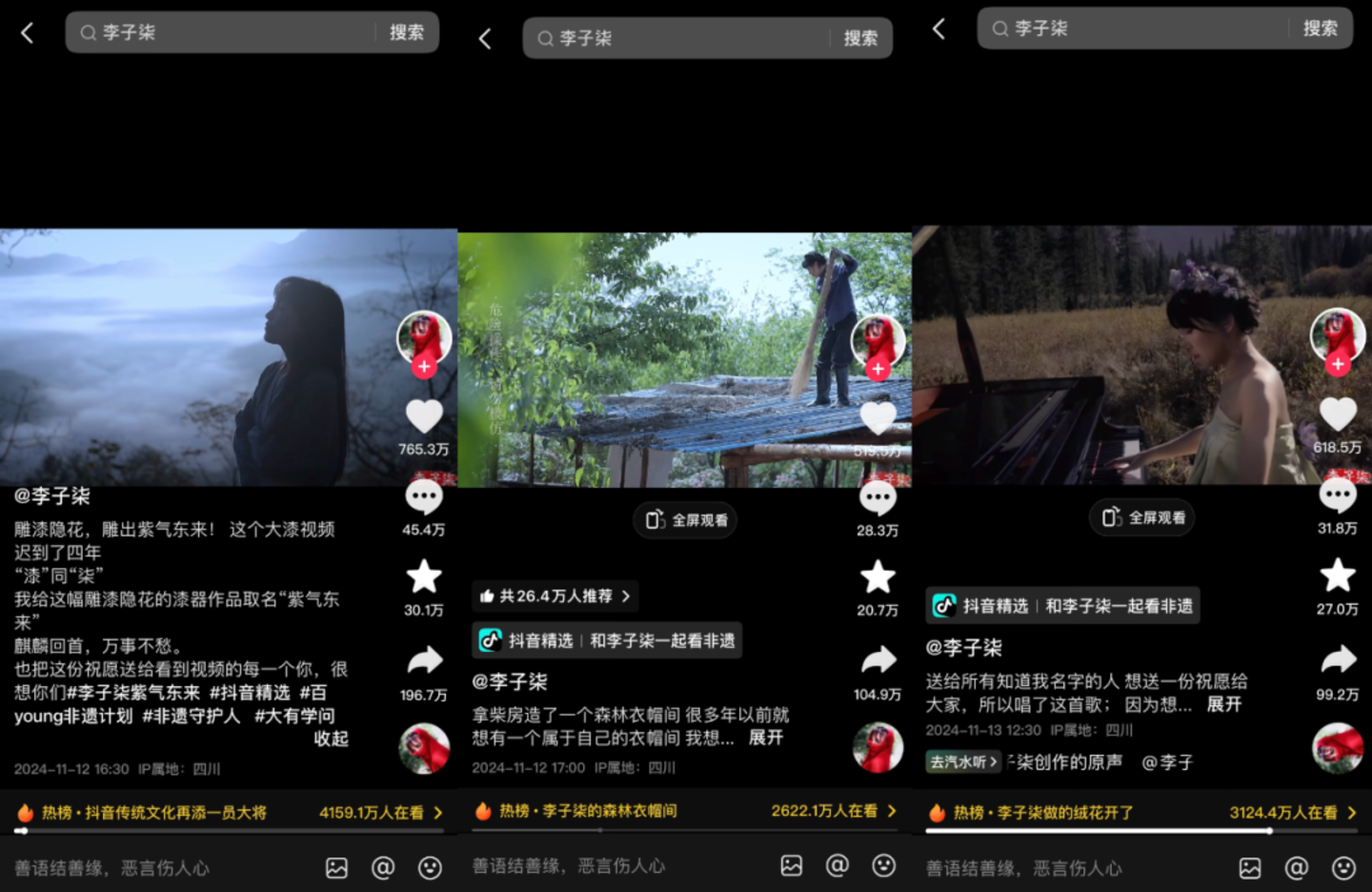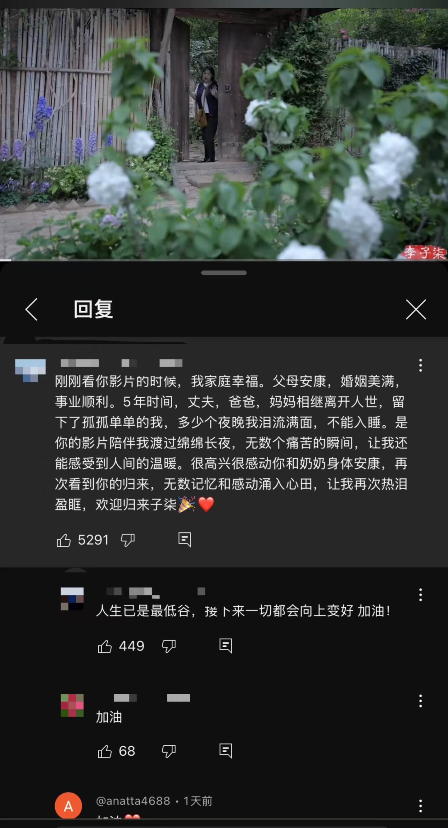 这种变化也真实地反映在部分粉丝身上,“我现在不怎么看李子柒了,不是内容不好,而是我看不进去长视频了,李子柒的视频就在那里放着,时不时瞄一眼”,圆圆向我们坦言。