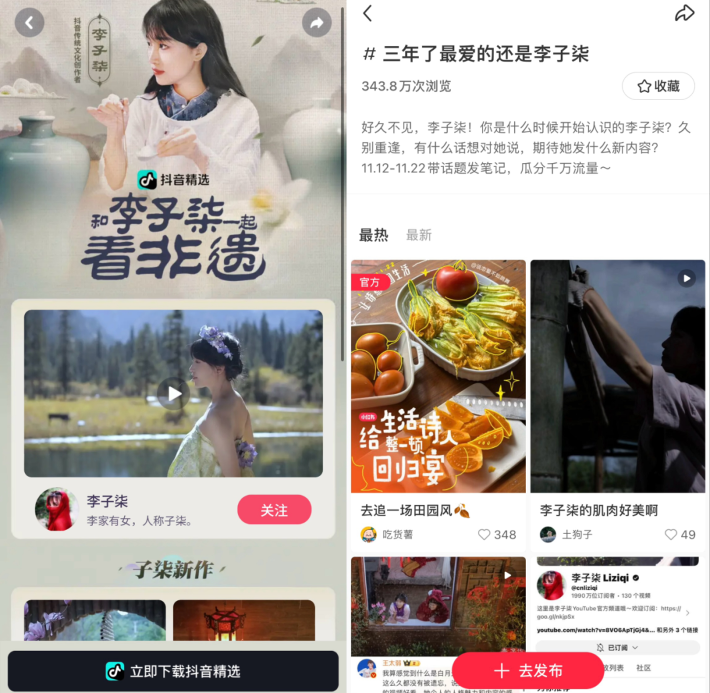 最后想提的是,李子柒并没有独家签约任何平台。据剁椒Spicy了解,归隐三年中,不止一家头部平台三顾茅庐,希望请得“诸葛出山”,签约独家协议。但从结果来看,此次李子柒的复出依然面向全渠道,内容同步发布,主打“雨露均沾”。热度加持下,各平台也主动做了相关话题或主题性合作。例如抖音设置了“和李子柒一起看非遗”的专属页面、小红书发起了#三年了最爱的还是李子柒的话题,吸引大家积极发帖。