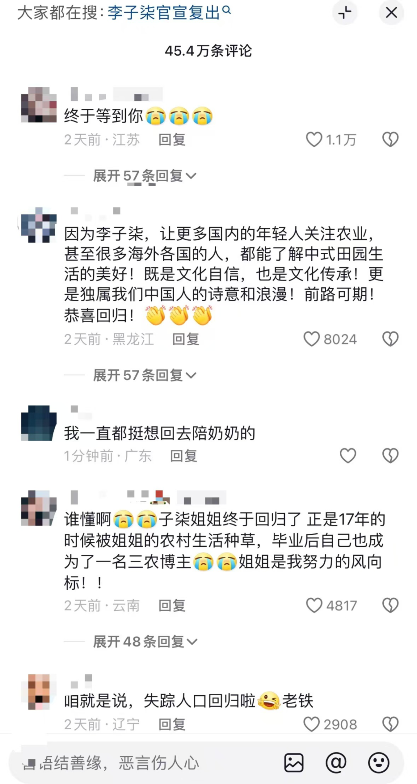 犹记得她停更的2021年,不真实、造作、竞争压力、热度持续性等关于李子柒的探讨比比皆是,但本次回归,压倒性的好评和期待成为主流。