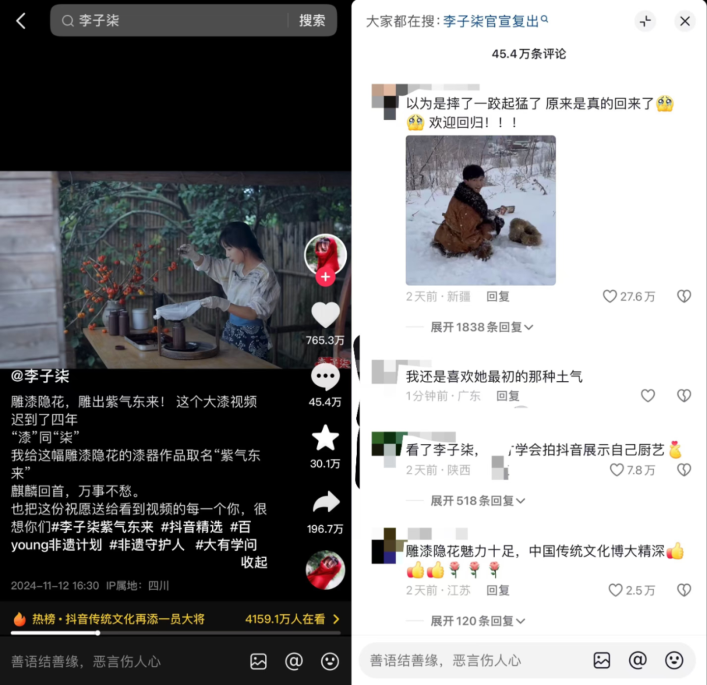 此外,复出后的李子柒对“非遗文化”的重视,也让其内容有了更深厚的文化底蕴。