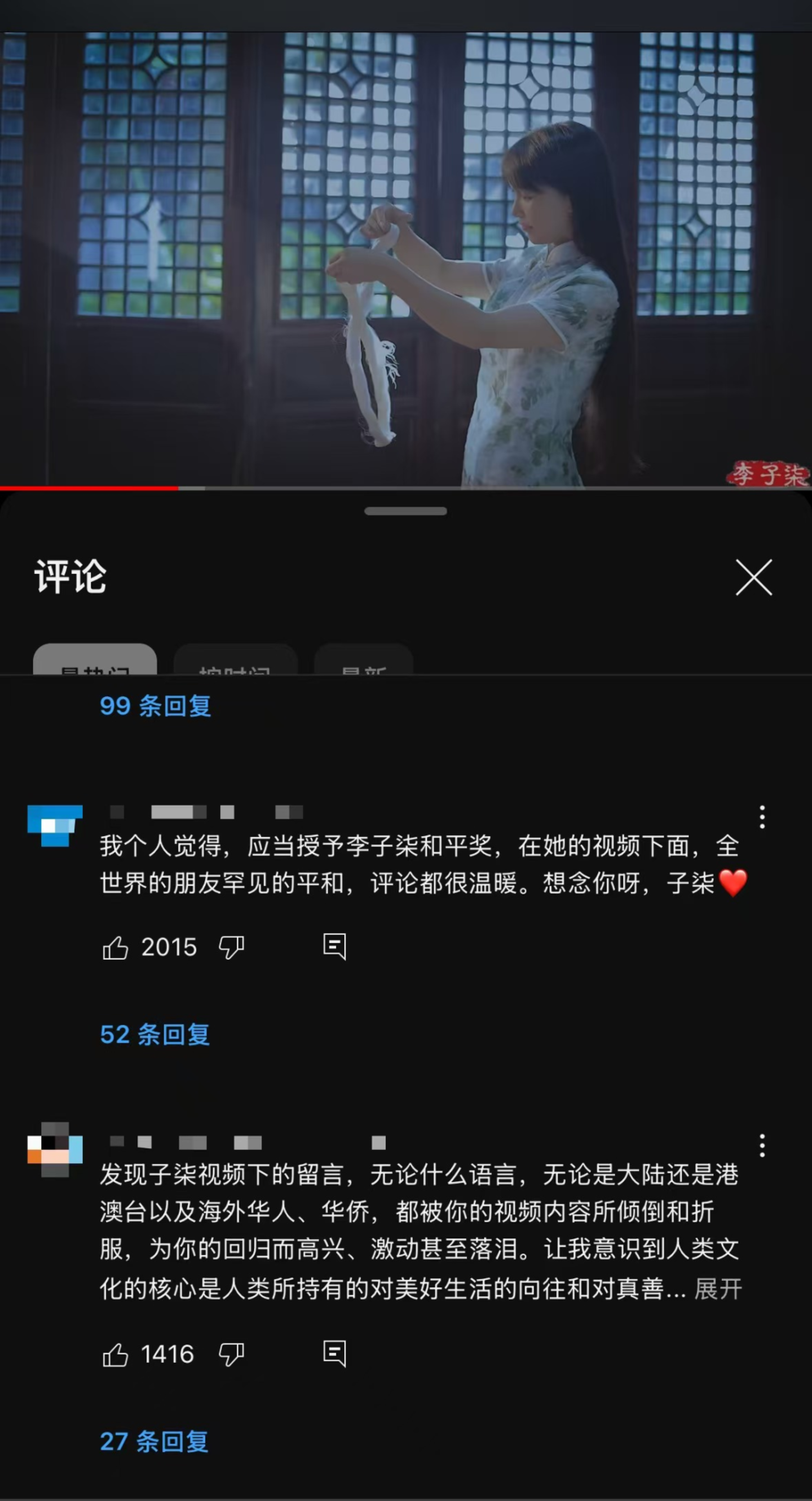 “在世界最需要李子柒的时候,她回来了”,“应该给李子柒诺贝尔和平奖”,Yotube有网友如此评论,有些夸张但引发无数点赞。