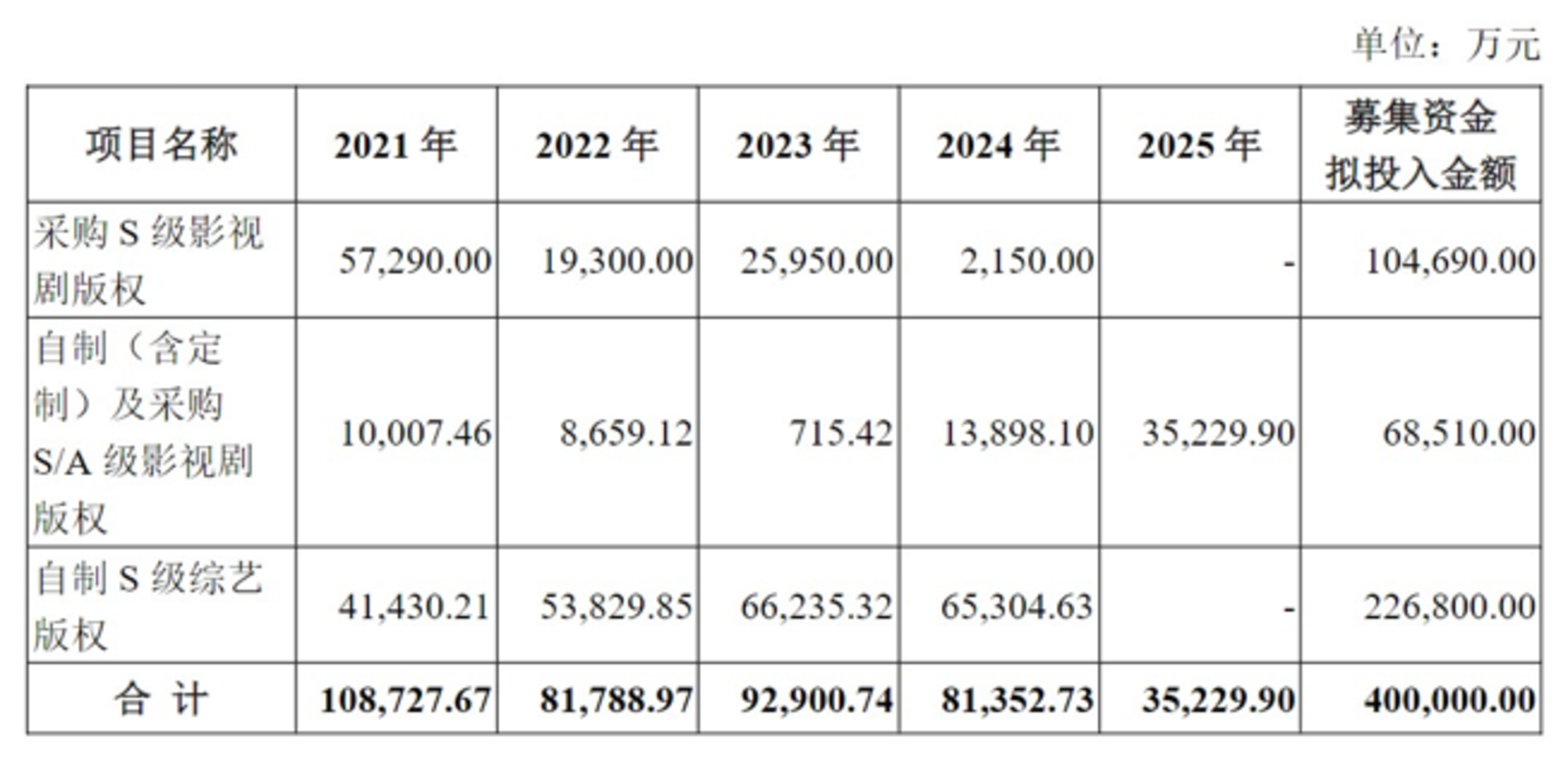 另外,从公司公布的募集资金内容资源库扩建项目情况来看,这个总金额40亿的项目中有17亿左右是“采购S级影视剧版权”以及“自制(含定制)及采购S/A级影视剧版权”,后者在2024年、2025年规划仍有数亿元规划,芒果TV后续在剧集领域的投入想必会继续扩大。