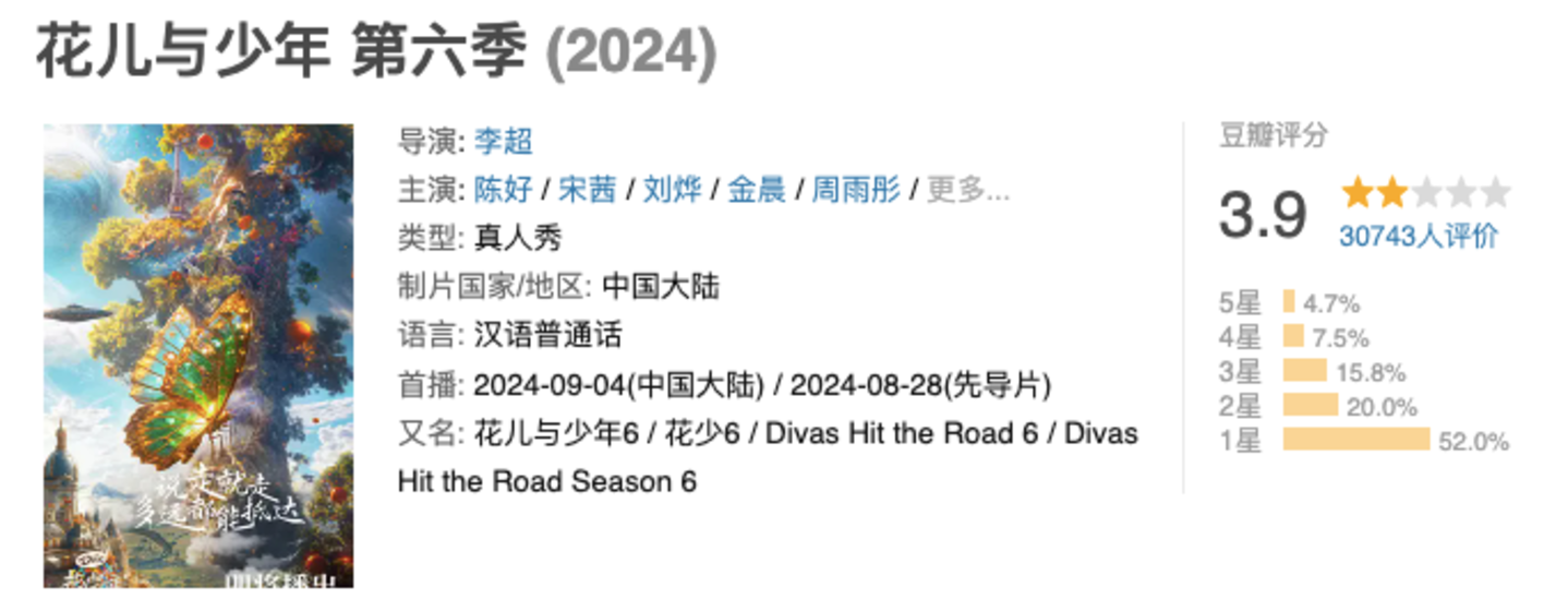 比如最近《花儿与少年6》豆瓣开分3.9分,不仅是系列最低分,也基本要坐稳2024年最低评分的综艺。但节目本身的主要内容并无太大变化,依旧是不同年龄的明星在经费有限、语言不通的情况下,全程自助完成旅行,然而对于这段旅程中所呈现出的矛盾、焦虑、不同性格思想碰撞,大众舆论明显不如主创们预期那样宽容。被放在放大镜下审判后,“荣梓杉巨婴”变成热词、周雨彤镜头里弹幕全是“呵呵”……