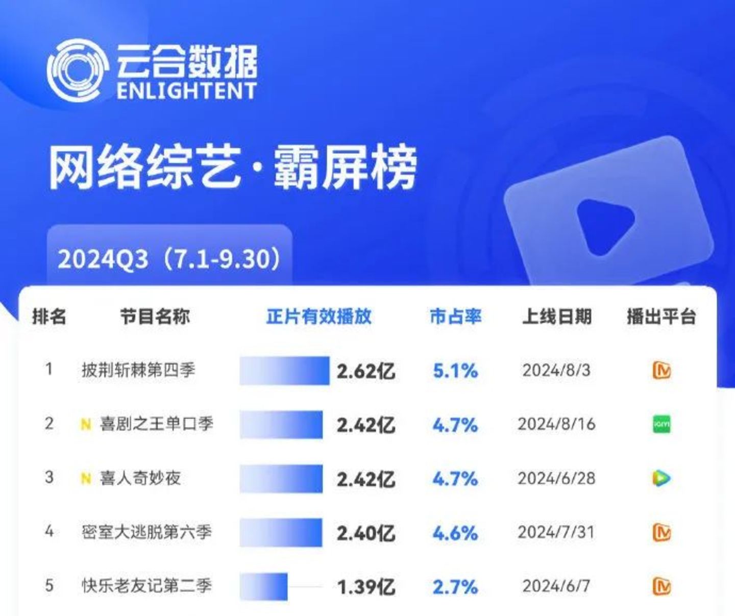 云合数据显示,2024Q3网络综艺霸屏榜、电视综艺霸屏榜TOP5中,芒果TV都占了三席,《你好星期六》《中餐厅8》《歌手2024》《披荆斩棘4》《密室大逃脱6》《快乐老友记2》等综艺在社交平台上的热度表现均可圈可点。