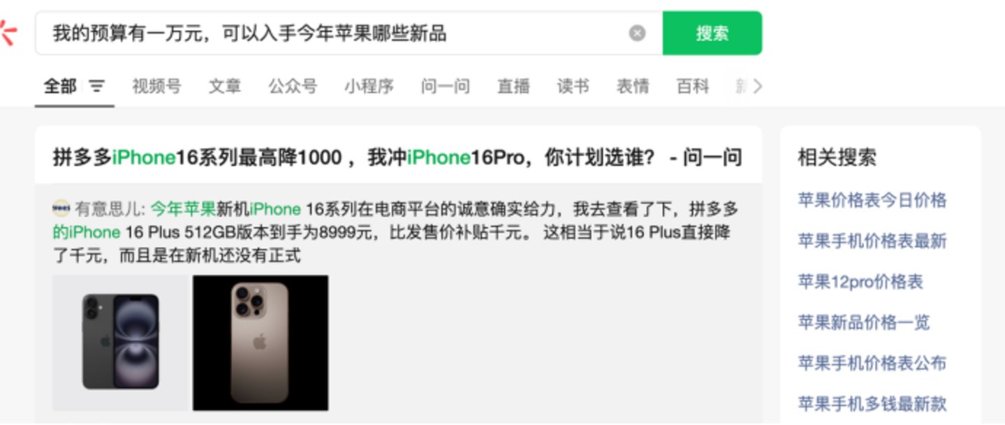 同样的问题在元宝中提问,得到的答案差不多,且参考来源基本一致,可以推测元宝和微信生态应该已打通。现在微信AI搜索呈现的方式类似于“随手搜”,回答偏向简洁,符合用户搜完即走的习惯。如果涉及到复杂检索和问题分析,暂时还得回到元宝。比如提问“今年苹果发布了哪些新品”,微信AI搜索尚可胜任,但若变成“预算一万元,可以入手哪些苹果新品”类似问题便会“卡壳”。